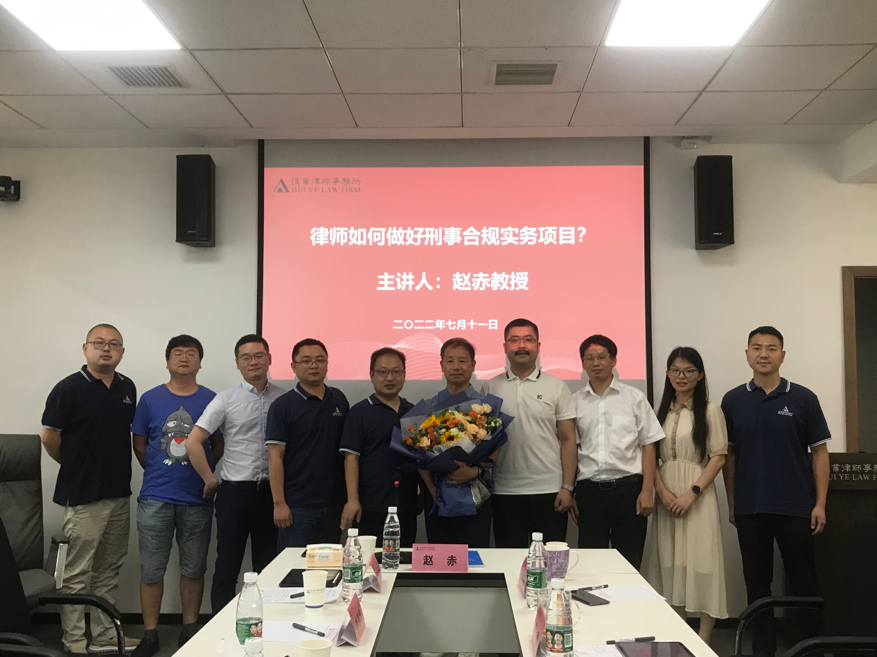 教授、刑法研究所所长、合规研究中心主任赵炎教授带来题为《律师如何做好刑事合规实务项目》的学术讲座。报告由邱帅萍书记主持,与谈人马驰升主任和王刚主任分别就赵赤教授报告结合自身工作经历进行讨论和交流。会议在座纷纷感谢赵赤教授精彩讲课,表示其能够解决工作中的困惑并受到启迪,受益匪浅。