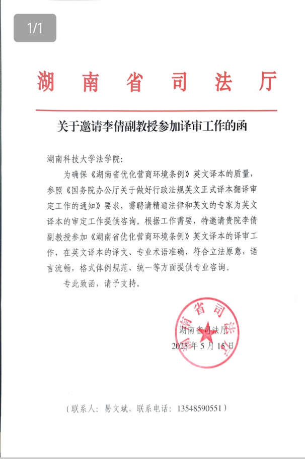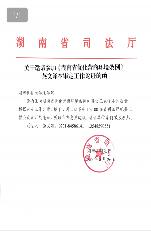副院长欧福永教授一同受邀负责《条例》英文版译审工作。近日,该条例英文本《Regulations of Hunan Province on Optimizing the Business Environment》已获湖南省人民政府正式发布。(详见//fgw.hunan.gov.cn/fgw/xxgk_70899/zcfg/dfxfg/202510/t20251014_33824922.html)